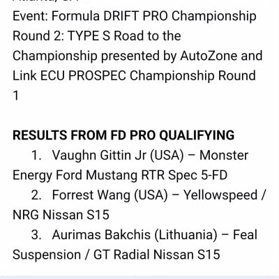 QUALIFYING RESULTS FROM ROUND 2 OF 2023 FORMULA DRIFT PRO AND ROUND 1 OF PROSPEC CHAMPIONSHIPS IN ATLANTA