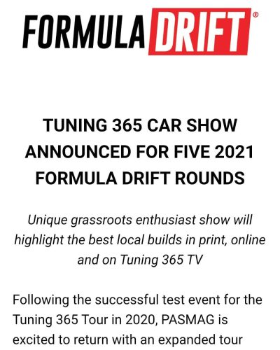 TUNING 365 CAR SHOW ANNOUNCED FOR FIVE 2021 FORMULA DRIFT ROUNDS