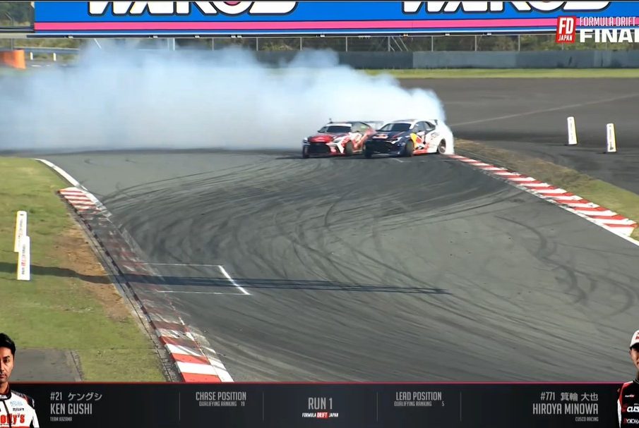 When a legend and a young star meet at the summit. Run 1 – @KenGushi and @Hiroya.Minowa lit up Fuji Speedway in the finals of FD Japan RD 1. #FormulaD #FormulaDRIFT #FDJ